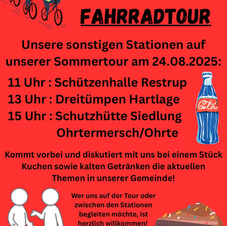 Am Sonntag, den 24.08.2025 schwingen wir uns aufs Rad und machen an mehreren Stationen Halt, um mit euch über die aktuellen Themen in unserer Gemeinde zu sprechen – ganz entspannt bei Kaffee, Kuchen, kalten Getränken und am Ende sogar mit Burgern & Würstchen. 🌭🍔🥤